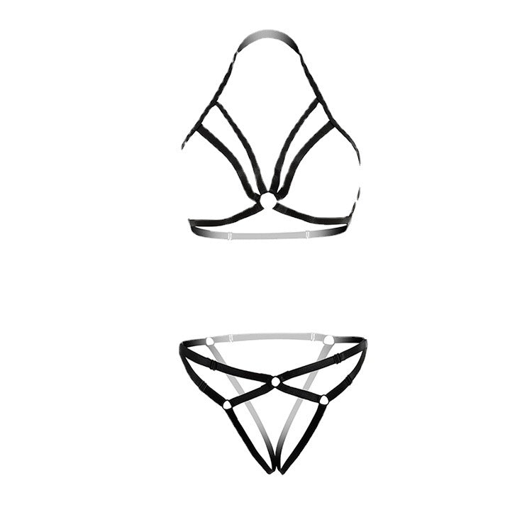 The innovative rope-style pattern uses elastic bands to create a striking visual effect. This contemporary design offers a bold alternative to traditional lingerie, with the elastic band construction providing both aesthetic appeal and comfortable flexibility. The unique pattern creates an artistic, fashion-forward look that celebrates the body.